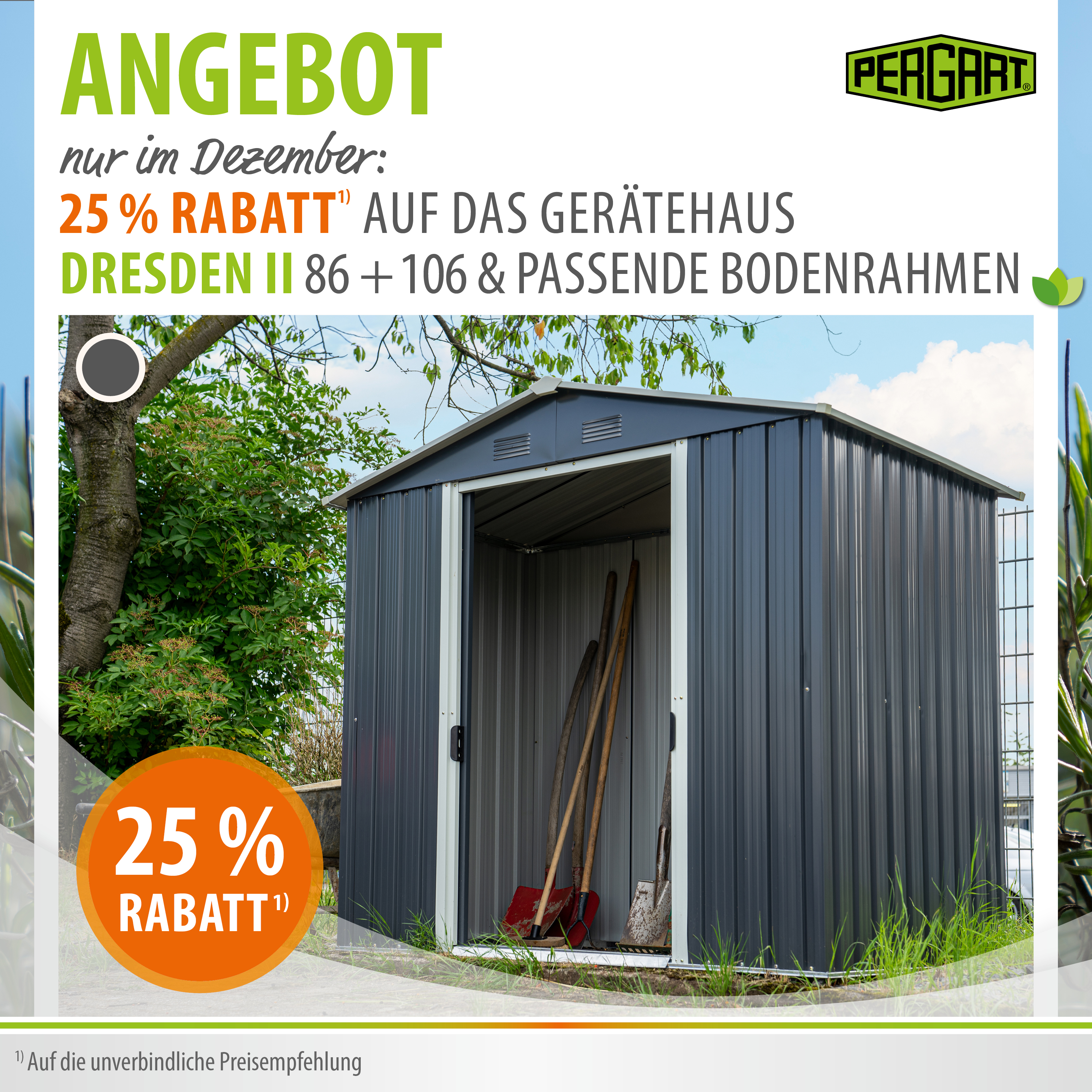 25% Rabatt auf das Metallgerätehaus Dresden II 86 und 106 und auf passende Bodenrahmen